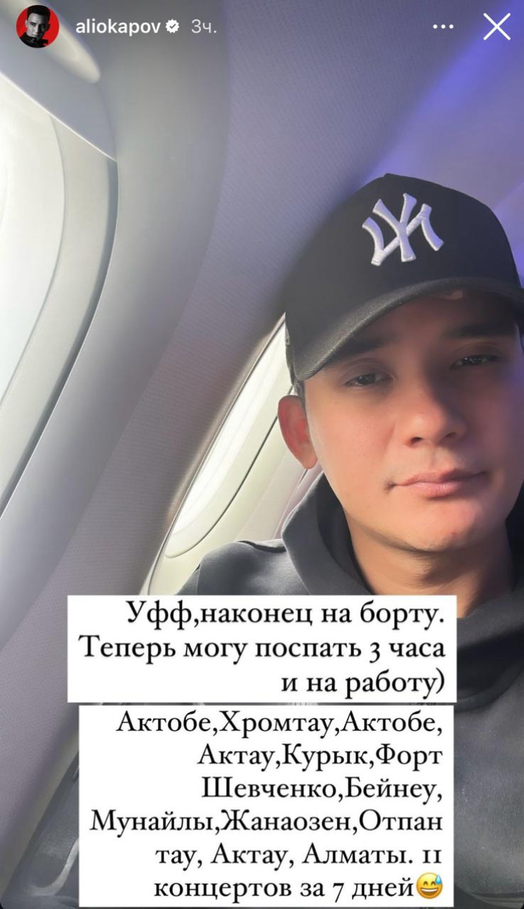"Задержка самолета уже 8 часов. Актау не отпускает, но дела в Алматы пылают пламенем", - отметил певец на своей странице в Instagram.
