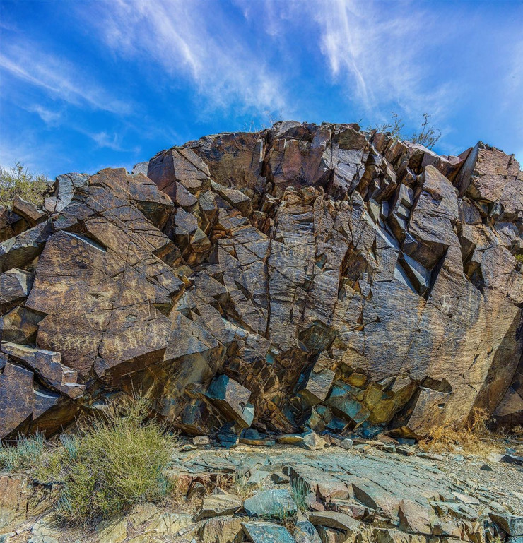 Шесть "солнцеголовых божеств", которые можно рассмотреть здесь, отличаются высотой (от 52 до 74 сантиметров), формой "нимбов", руки их либо опущены, либо подняты вверх, а сами они развернуты или влево (на запад), или вправо (на восток), или фронтально (север и юг). Седьмое "божество", представленное только торсом и головой, расположено над ними. А под ними, слева, можно увидеть две противостоящие друг другу фигуры людей в молитвенной позе, над которыми - фрагмент сцены "священного брака". Предполагается, что петроглифы были нанесены в эпоху бронзы. Данная композиция не имеет аналогов.