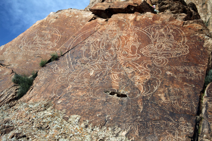 В средние века высечены изображения сидящего в "пиршественной позе" антропоморфного божества с лучами вокруг головы, конные всадники, олени, а также тамги тюркских племен.