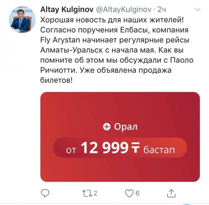"Хорошая новость для жителей! Согласно поручению Елбасы компания FlyArystan начинает регулярные рейсы Алматы - Уральск с начала мая. Уже объявлена продажа билетов", - отметил в своем Twitter-аккаунте аким области Алтай Кульгинов.