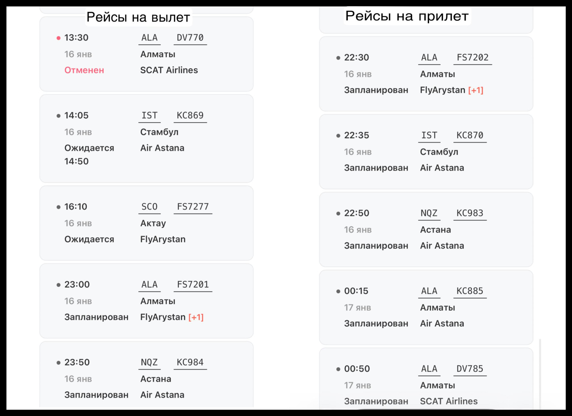 • отменён — 1 рейс (Атырау – Алматы);