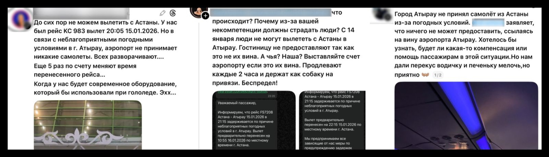 "До сих пор не можем вылететь из Астаны. Наш рейс KC 983 должен был вылететь в 20:05 15 января, но из-за неблагоприятных погодных условий в Атырау аэропорт не принимает самолёты — всех разворачивают. Кроме того, время перенесённого рейса уже меняли пять раз. Когда у нас появится современное оборудование, которое можно использовать при гололёде?" — написал пассажир.