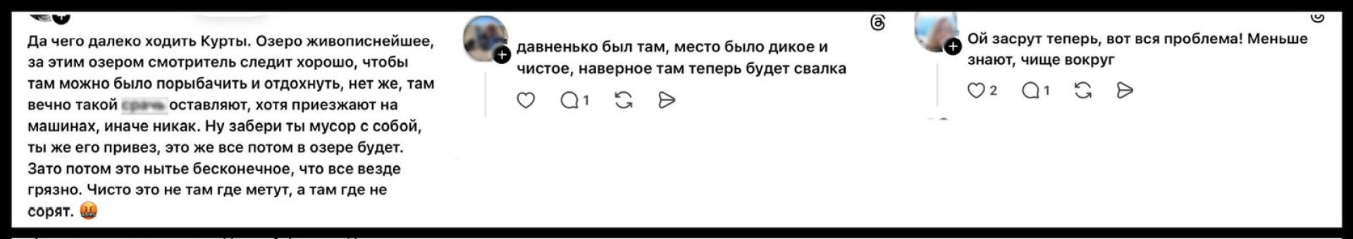 - "Да чего далеко ходить — Курты. Озеро живописнейшее. Вроде за этим озером смотритель следит хорошо, чтобы можно было порыбачить и отдохнуть, — нет же, там вечно мусор оставляют, хотя приезжают на машинах (иначе никак). Ну забери ты с собой, ты же его привез! Это же всё потом в озере будет".