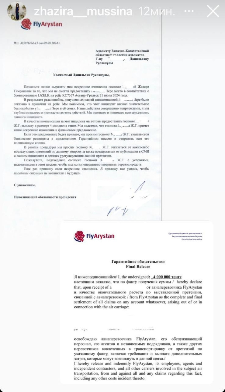 На своей странице в Instagram Жазира рассказала, что ей позвонили из авиакомпании FlyArystan.