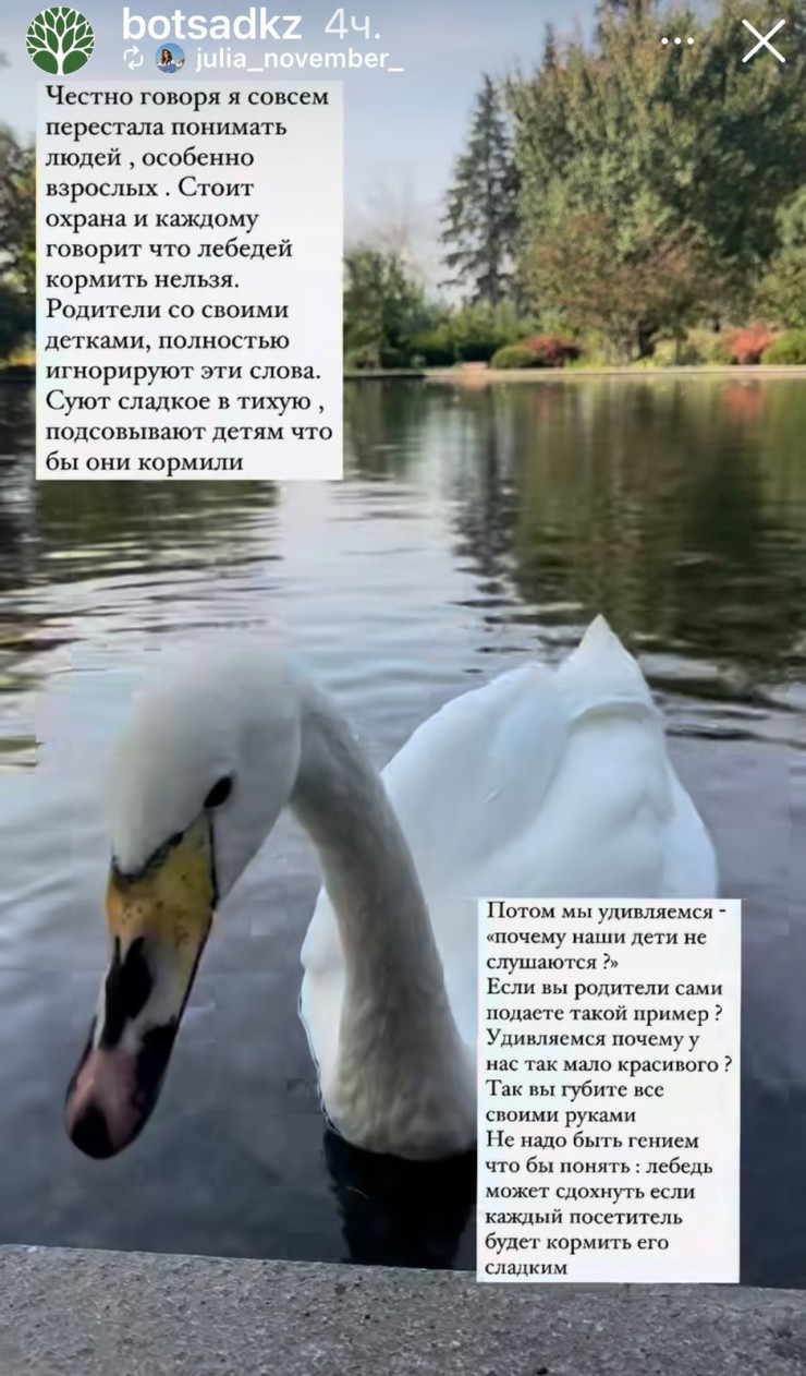 Представитель Ботанического сада прокомментировал обращение девушки и пояснил, почему лебедей нельзя подкармливать. Начальник отдела маркетинга и PR Института Ботаники и Фитоинтродукции Баян Коспенбетова напомнила, что экспертами для птиц разработан специальный рацион, согласно которому и кормятся лебеди, другими продуктами их кормить запрещено.
