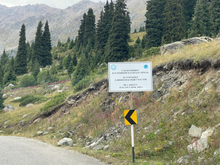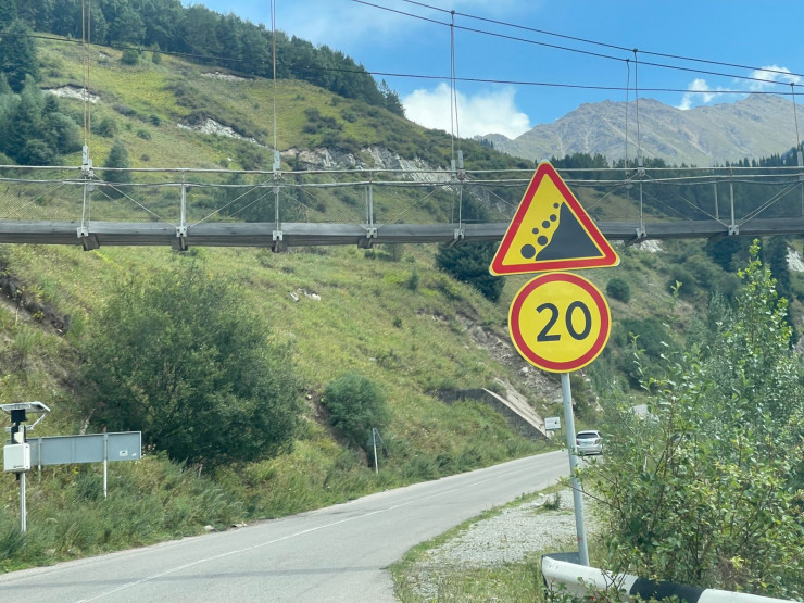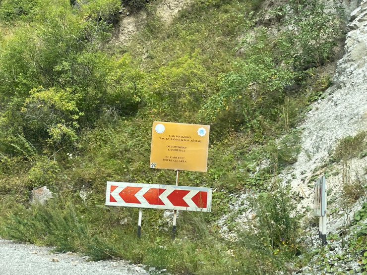Также стоят таблички, указывающие на опасный участок. Здесь временами наблюдается камнепад. Поэтому проезжать нужно с особой осторожностью.