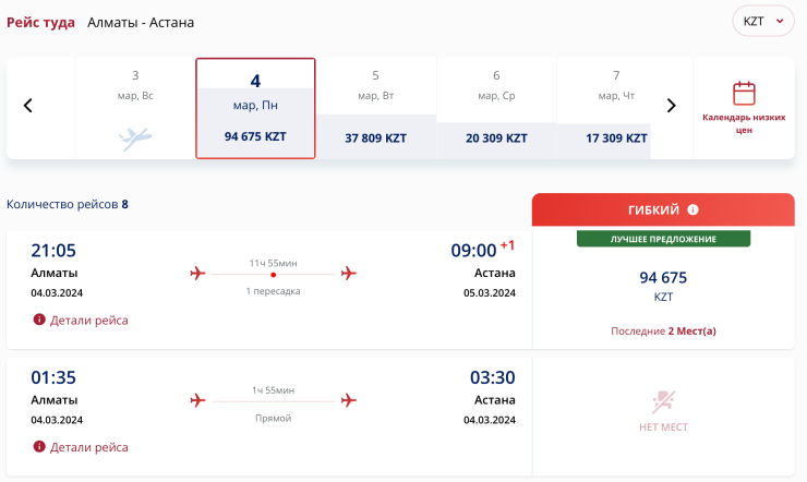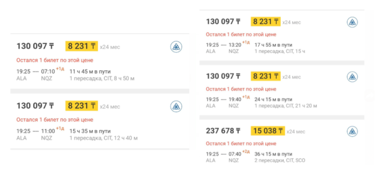 Мы проанализировали цены на ближайшие рейсы от компаний. Отметим, что цена билетов варьируется от 107 тысяч тенге и выше. К примеру, осталось 2 билета от 94 675 тысяч тенге от Fly Arystan, компания планирует выполнить рейс примерно в 9 вечера.
