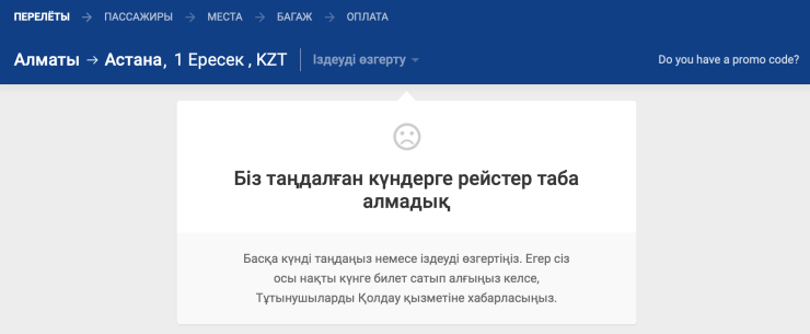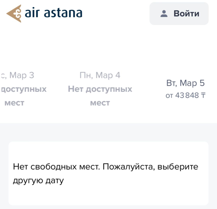 Аналогичная ситуация и с Air Astana, точнее, билеты на рейс уже выкуплены. Отметим, что направление Алматы – Астана является востребованным, по этой причине отсутствие билетов у компании – стандартная ситуация.