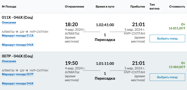 Однако есть билеты на проезд с пересадкой, то есть можно составить себе маршрут. К примеру, из Алматы в Шымкент, далее - из Шымкента в Астану. Стоимость билета варьируется от 16 тысяч тенге, а длительность поездки составляет чуть больше суток.
