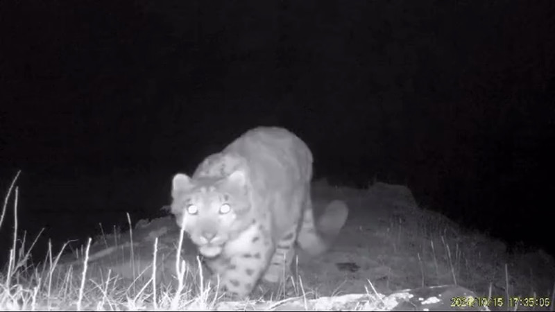 В Катон-Карагайском государственном национальном природном парке засняли снежного барса, который живо интересуется камерой и внимательно изучает