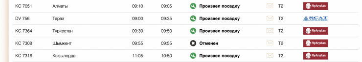 По данным онлайн-табло аэропорта Астаны, рейс KC 7308 действительно был отменен.