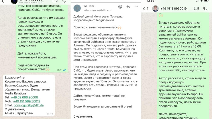 Также у авиакомпании имеется контакт центр для пассажиров в Казахстане: +7 727 349 72 02. В случае перебоя телефонной сети в Казахстане обратитесь в сервисный центр в Германии на английском языке по телефону: +49 69 86 799 799 или в Армении по телефону: +374 60 680081 согласно графику работы", - порекомендовали в ведомстве.