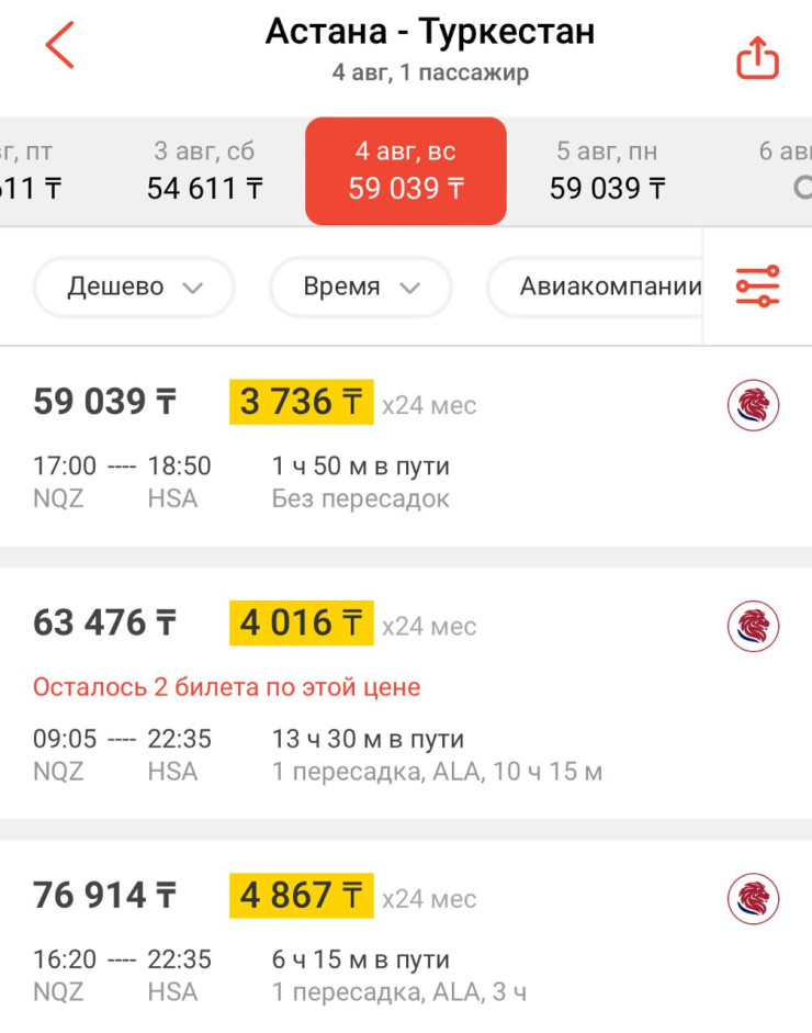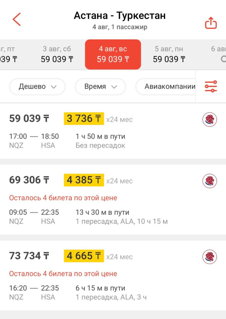 "Хотела купить билеты у известного лоукостера из Астаны до Туркестана на 4 августа. Выяснилось, что билет в одну сторону без пересадок стоит примерно 59 тысяч тенге. Почему так дорого?" – удивилась читательница.