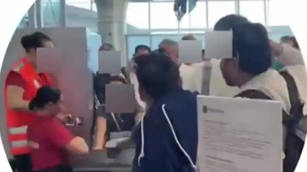 На кадрах видно, как многочисленные пассажиры окружили стойку регистрации. Некоторые начали кричать и крушить технику.