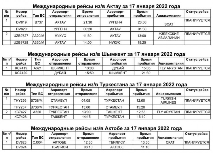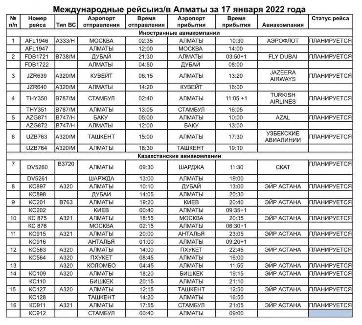 Комитет гражданской авиации МИИР РК опубликовал информацию о международных и внутренних рейсах на 17 января, передает Tengritravel.kz.