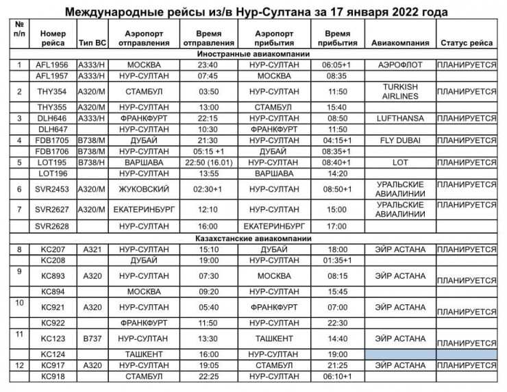 17 января 2022 года из/в Нур-Султан планируется выполнение 23 международных рейсов в Москву, Стамбул, Дубай, Варшаву, Жуковский, Екатеринбург, Ташкент, Франкфурт и обратно.
