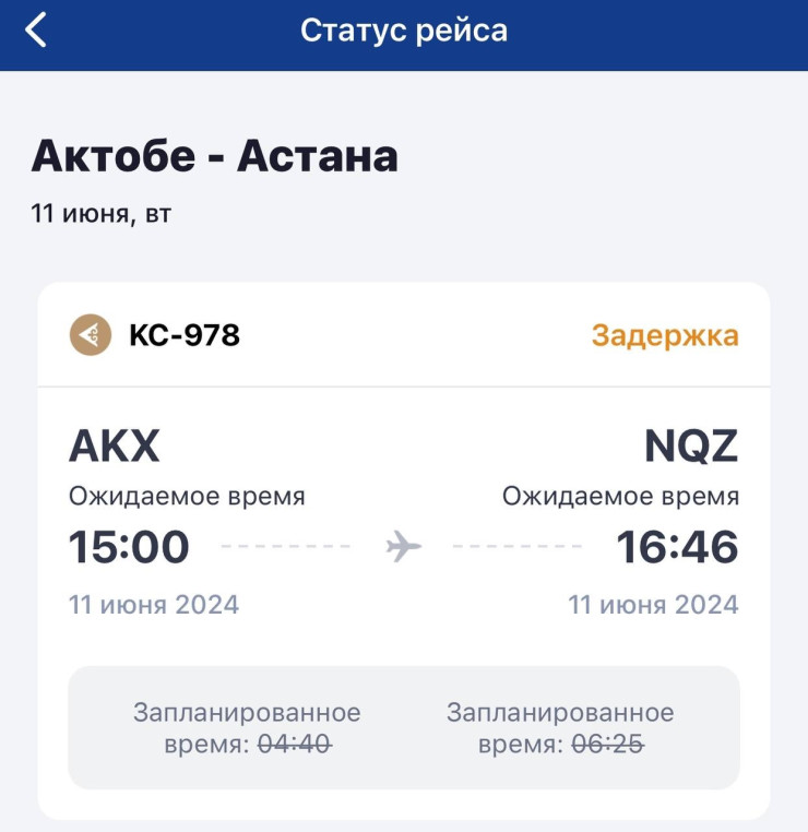 В наше издание на редакционный номер WhatsApp написал читатель по поводу рейса Актобе – Астана. Уточняется, что самолет должен был вылететь сегодня рано утром, но рейс несколько раз переносили.