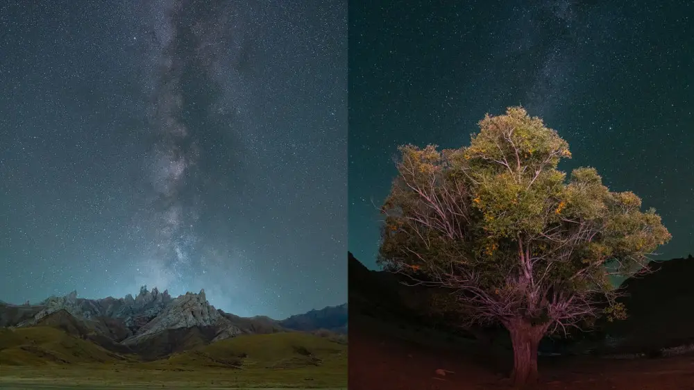 "Келиншектау - одно из моих любимейших мест в Казахстане. Погода как раз выдалась идеальная: чистый воздух и не было облаков. Поэтому я не упустил момент снять звёздное небо. Снимал на фотокамеру с разными светосильными объективами в зависимости от сцены. Современный смартфон тоже может передать картинку звёздного неба, я уже показывал такие снимки с подробными настройками. Но, конечно, у профессиональной камеры больше возможностей и шире динамический диапазон", - рассказал он нам.