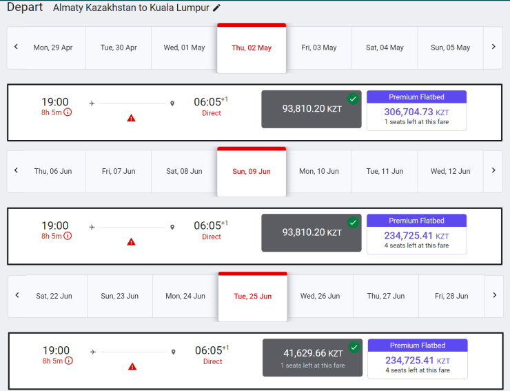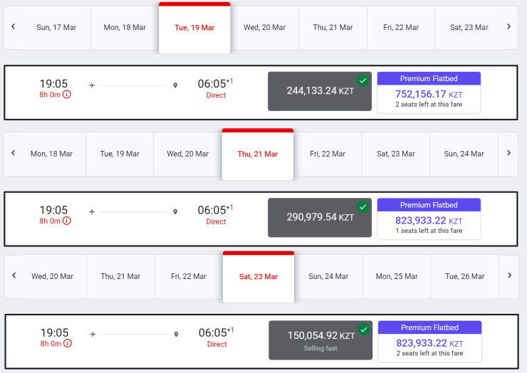 Но на ближайшие даты цены остаются высокими - до 290 тысяч тенге в одну сторону.