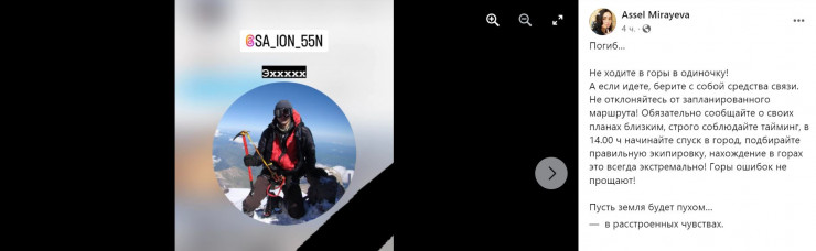 "Предварительно это турист, поиски которого проводятся четвертый день. Гражданин Российской Федерации 1984 года рождения убыл в горы утром 5 августа и пропал.
