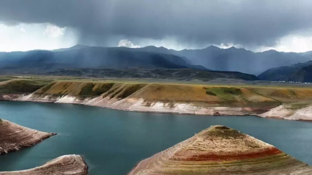 3. Фото, на котором изображено озеро Тузколь. Водоем расположен на высоте 1 959 метров, в замкнутой бессточной впадине между горами Ельшын Буйрык и Каратау на севере и Жабыртау на юге. Горы эти относятся к одному из хребтов Северного Тянь-Шаня - Кетмень (Узынкара).