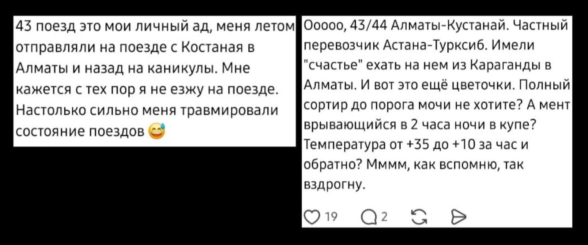 В комментариях многие пользователи признались, что маршрут Алматы – Костанай давно ассоциируется у них с не самым комфортным сервисом.