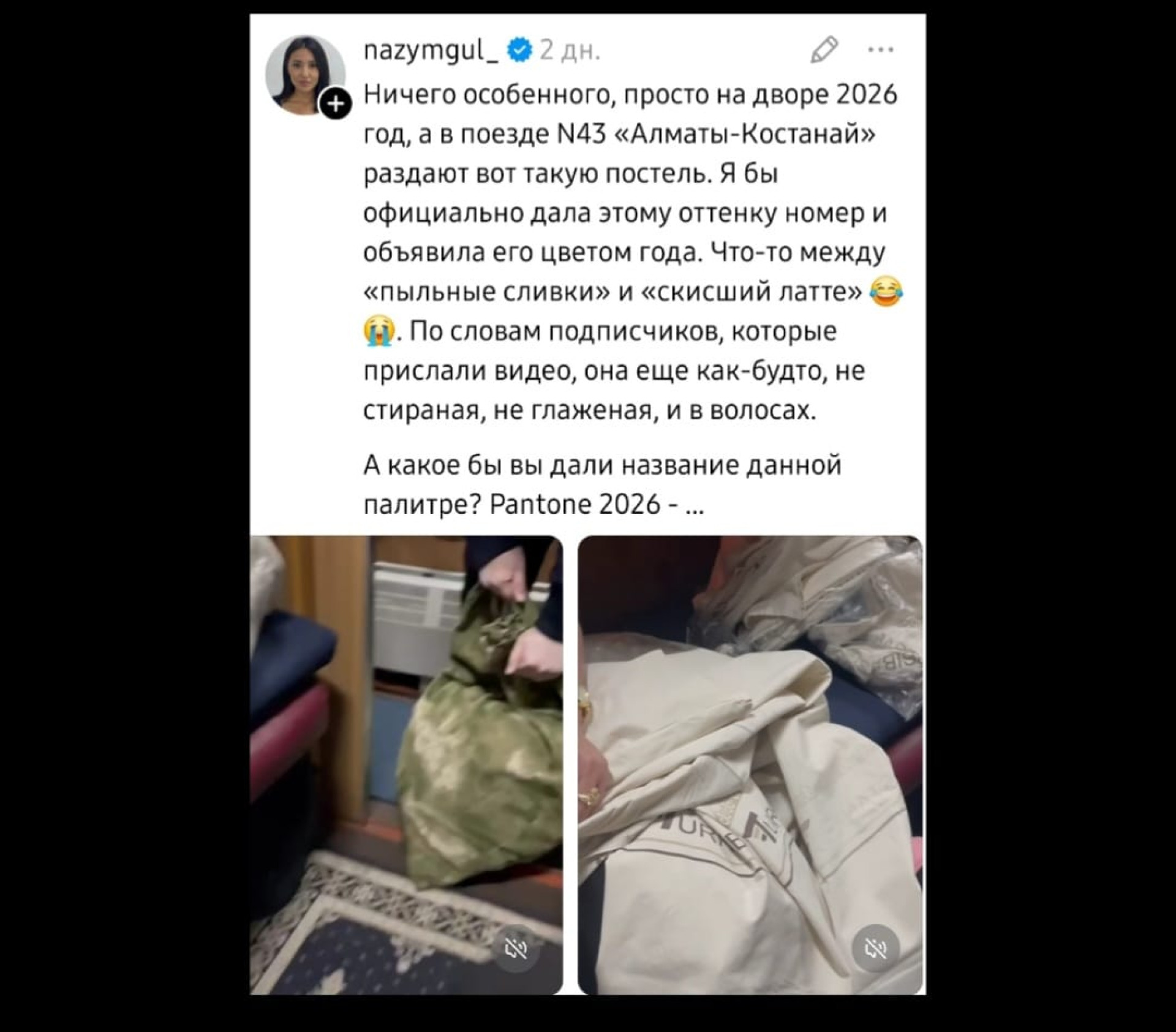 "Ничего особенного, просто на дворе 2026 год, а в поезде № 43 Алматы — Костанай раздают вот такую постель. Я бы официально дала этому оттенку номер и объявила его цветом года. Что то между "пыльные сливки" и "скисший латте". По словам подписчиков, которые прислали видео, она еще как будто нестираная, неглаженая и в волосах. А какое бы вы дали название данной палитре? Pantone 2026", — говорится в публикации.