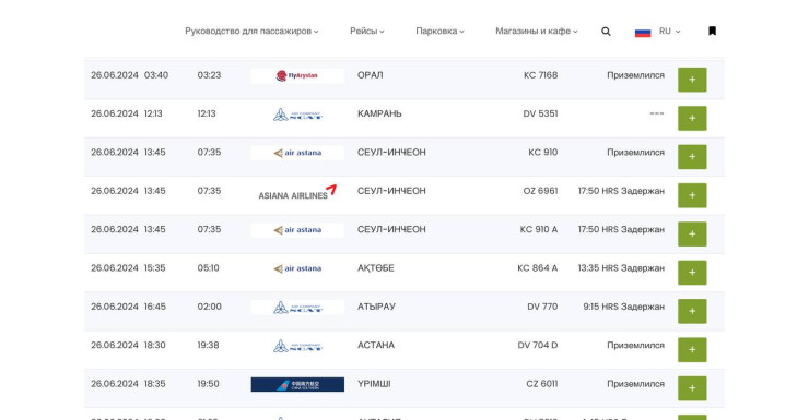На вылет по состоянию на 21:20 задержек уже нет, однако есть как минимум два отмененных рейса авиакомпании SCAT: из Астаны в Алматы (DV 704) и из Астаны в Актау (DV 743).