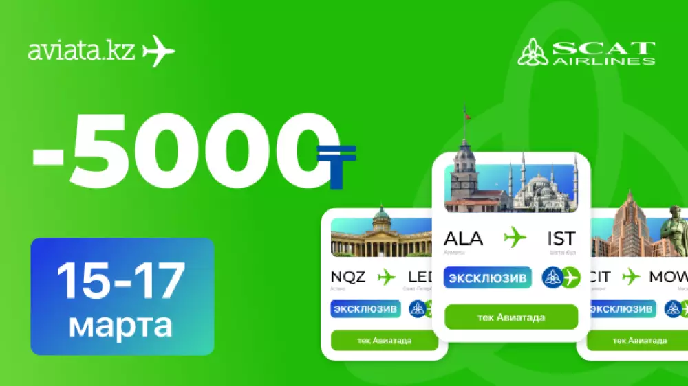 На Aviata.kz стартовала эксклюзивная акция! Только с 15 по 17 марта включительно заказ с авиабилетами SCAT можно оформить со скидкой 5000 тенге.