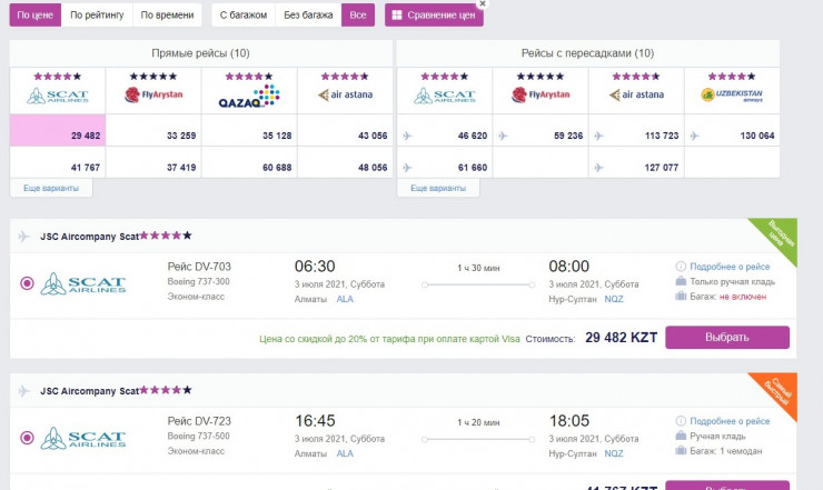 Билеты на рейс Алматы - Нур-Султан на 3 июля 2021 года. Скриншоты с сайтов агрегаторов по продаже билетов