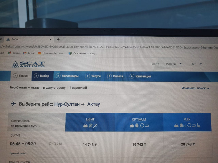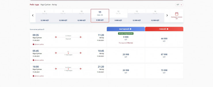 Рассмотрим вариант покупки билета по направлениям Алматы - Нур-Султан и Нур-Султан - Актобе (один из самых популярных у авиакомпании, рейса из столицы в Актау у Qazaq Air нет) через месяц - 21 июля 2021 года по тарифу "Легкий":