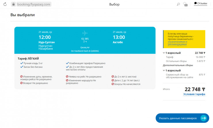 Рассмотрим вариант покупки билета по направлениям Алматы - Нур-Султан и Нур-Султан - Актобе (один из самых популярных у авиакомпании, рейса из столицы в Актау у Qazaq Air нет) через месяц - 21 июля 2021 года по тарифу "Легкий":