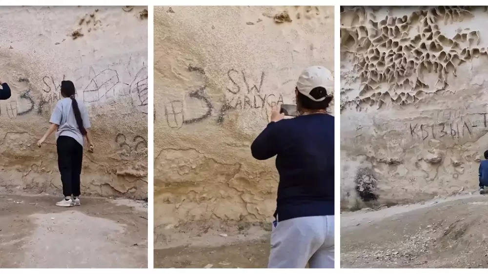 В живописном каньоне Ыбыкты сай в Мангистауской области туристы засняли на видео очередной случай вандализма, передает Tengri Travel со ссылкой на inaktau.kz.