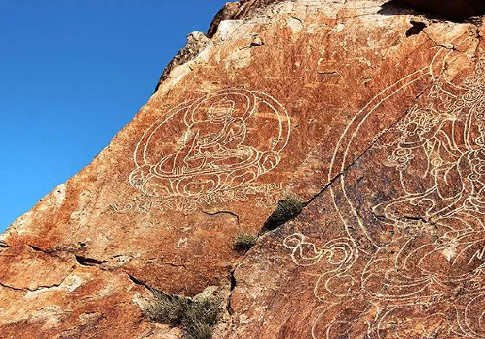 На берегу реки Или, в 170 километрах от Алматы, расположен Тамгалы-Тас, что в переводе означает "камни со знаками". Здесь около пяти веков назад на черной поверхности скал неизвестные мастера высекли множество рисунков, среди которых изображения Будды и Бурханов (Бодхисаттв), сопровождающиеся тибетскими надписями.