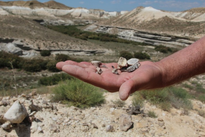 "Такое мы не могли пропустить и сразу же скорректировали свой маршрут и заехали сюда. И вот, после часовых поисков зубы акул мы действительно нашли. Дело в том, что тело акулы состоит в основном из хрящей и поэтому практически полностью разлагается, за исключением зубов. А здесь раньше было древнее море Тетис, в которое входили и Каспийское и Аральское моря", - рассказал руководитель экспедиции Жанат Айтхожин.