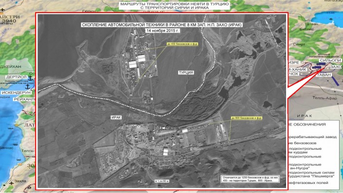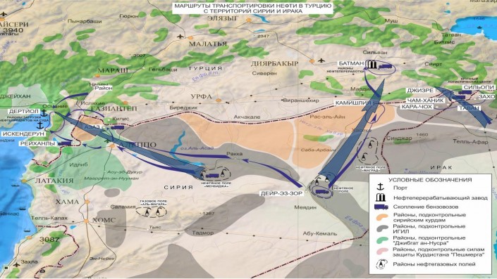 Рудской отметил, что выявлено три основных маршрута передачи нефти в Турцию из подконтрольных бандформированиям районов Сирии и Ирака. Западный маршрут выходит к турецким портам на побережье Средиземного моря, северный - к нефтеперерабатывающему заводу Батман на территории Турции, а восточный - к крупной перевалочной базе в населенном пункте Джизре.