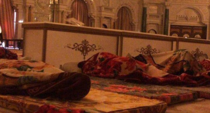 На кадрах показано большое фойе, на полу которого расстелены матрасы. На них под коврами спят члены королевской семьи и другие высокопоставленные лица, подозреваемые в коррупции. Им запретили выезд из страны, заморозили их банковские счета.
