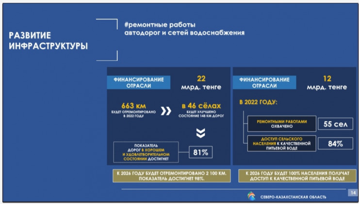 В этом году отремонтируют 663 километра дорог, из бюджета направлено 22 миллиарда тенге. До 2026 года ремонтом охватят 2,1 тысячи километров дорог, тем самым приведут в порядок практически все дороги области.