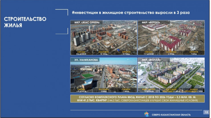 В целом, согласно комплексному плану, до 2026 года будет ведено 3,3 миллиона квадратных метров жилья. 144 тысячи североказахстанцев улучшат свои жилищные условия. Это треть всего населения области.