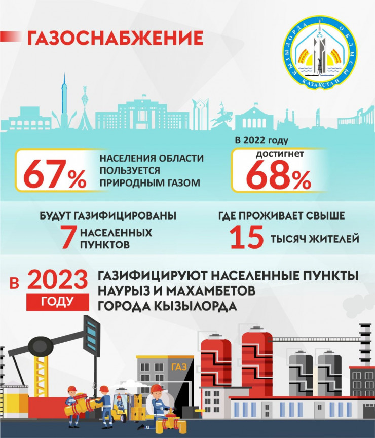 Напомним, по итогам прошлого года газифицированы 3 города (Кызылорда, Аральск, Байконур) и 17 сельских населенных пунктов. В текущем году природным газом будут обеспечены 7 населенных пунктов.