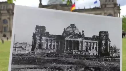 Согласно журналу боевых действий 150-й стрелковой дивизии, в 14 часов 25 минут 30 апреля 1945 года лейтенант Кошкарбаев и рядовой Булатов "по-пластунски подползли к центральной части здания и на лестнице главного входа поставили красный флаг". В своем видео Батыр Какимжанович сравнивает, как выглядело это историческое место 9 мая 1945 года и каким оно стало в 2014 году.
