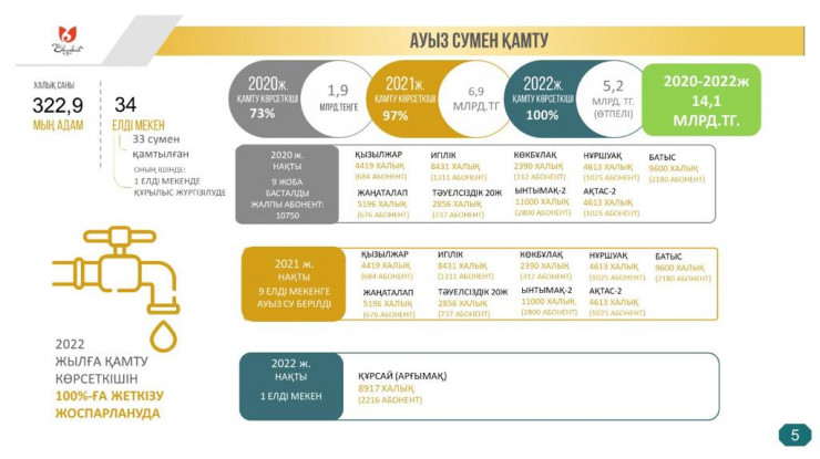 "Отличие Шымкента от других городов республиканского значения в том, что на его территории имеется 81 микрорайон и жилой массив. 41 из них были сельскими поселками, потом присоединились к территории города. Мы ведем поэтапную работу по обеспечению этих населенных пунктов полной инфраструктурой, инженерно-коммуникационными сетями и социальными объектами. Так, 10 из 34 населенных пунктов Абайского района до 2020 года не имели централизованной системы питьевой воды. За прошедшие два года в девяти из них появилась качественная питьевая вода. В этом году район будет обеспечен питьевой водой на 100 процентов", – сказал Мурат Айтенов.