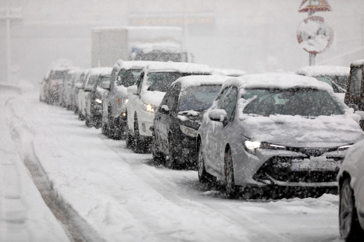 Многокилометровые пробки появились на магистрали, по которой авто на летней резине не могут двигаться. Дело в том, что в Греции зимние шины практически не используются, так как на большей части страны зимой не бывает снега. Снегоуборочные машины практически не видны.