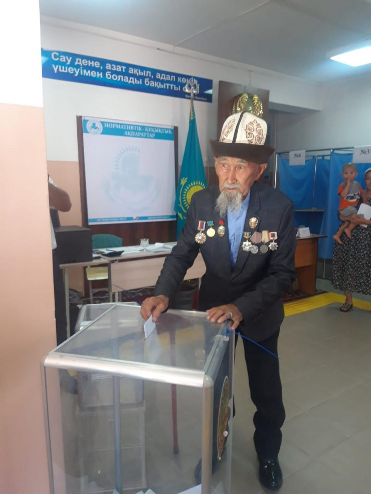 Одним из первых проголосовал 65-летний Сайлаубек Жаксыбеков. Он пришел на свой избирательный участок с пятью внуками, с которыми публично исполнил гимн.