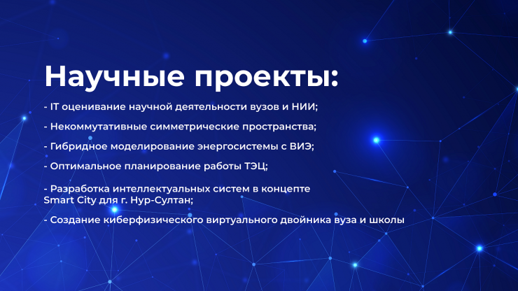 Сегодня AITU осуществляет исследования в IT-сфере по мультидисциплинарным направлениям: смарт-системы и технологии, цифровые двойники, EdTech, FinTech, AgroTech и энергетические системы. Проекты выполняются по программно-целевому и грантовому финансированию МОН РК, а также по хозрасчетным договорам с предприятиями.