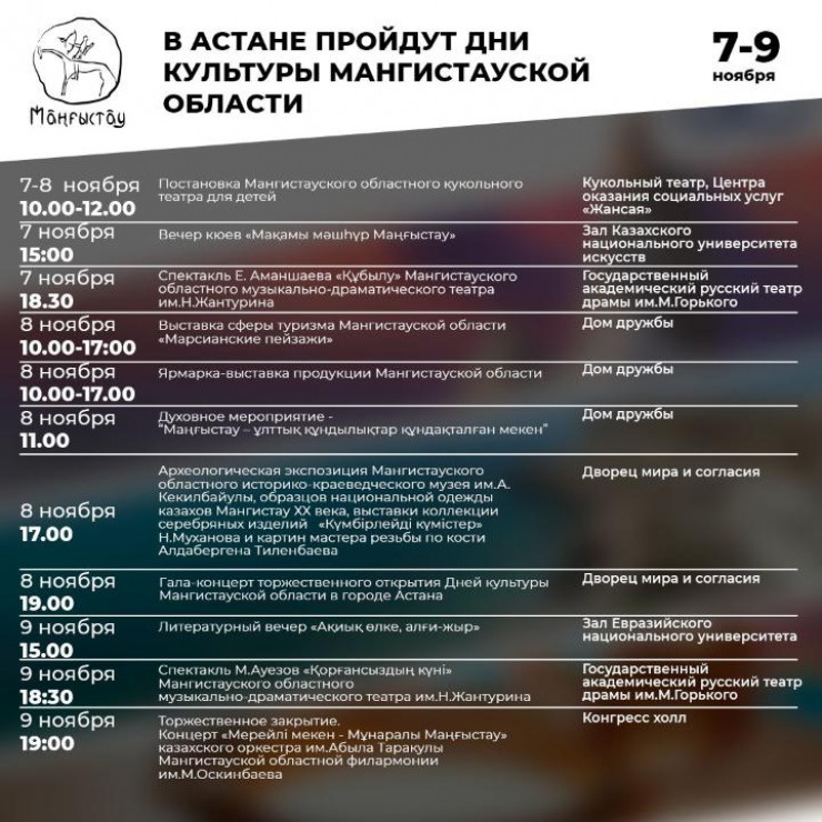 Также 9 ноября в рамках Дней культуры Мангистау в 15:00 в стенах Евразийского национального университета пройдет литературный вечер "Ақиық өлке, алғи-жыр".
