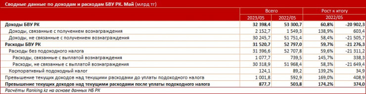 Расходы БВУ РК составили 31,5 триллиона тенге, в том числе без учета подоходного налога — 31,4 триллиона тенге. В том числе расходы, связанные с выплатой вознаграждения, составили 1,1 триллиона тенге, не связанные — 30,3 триллиона тенге. Корпоративный подоходный налог в свою очередь составил 124,1 миллиарда тенге.
