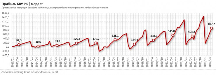 Примечательно, что доходы БВУ РК сократились за год на 39,2 процента, а расходы — сразу на 40,3 процента, хотя подоходный налог увеличился на 39,2 процента. В результате прибыль (то есть превышение текущих доходов над текущими расходами) до уплаты подоходного налога соответственно составляла 1 триллион тенге (плюс 69 процентов за год), а после — уже рассмотренные 877,7 миллиарда тенге.