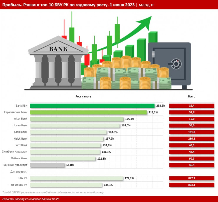 На втором месте по годовому увеличению прибыли — Евразийский банк: здесь рост составил почти 2,2 раза, до 54,6 миллиарда тенге. На третьем месте Altyn Bank: плюс 75,1 процента, до 15 миллиардов тенге. Замыкают пятёрку лучших Jusan Bank (плюс 68 процентов, до 50 миллиардов тенге) и Kaspi Bank (плюс 43,6 процента, до 181,8 миллиарда тенге).