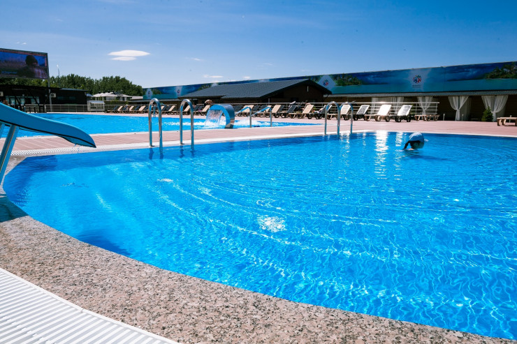 На территории расположились детский и взрослый бассейны с подогревом и фильтрацией, фуд-корт, бар, волейбол, футбол, поле для мини-гольфа. Гостям будут предоставлены душевые кабины, комфортные шезлонги и полотенца.
